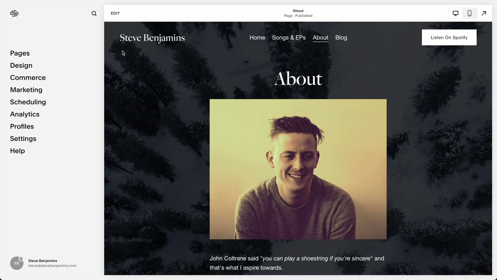 After selecting a template, customize its fonts and colors, and even the buttons and animations, to match your brand’s style. You can wait to do this until all pages and content are fixed, but since Squarespace is a WYSIWYG builder, I recommend customizing early to see how everything looks as you edit.